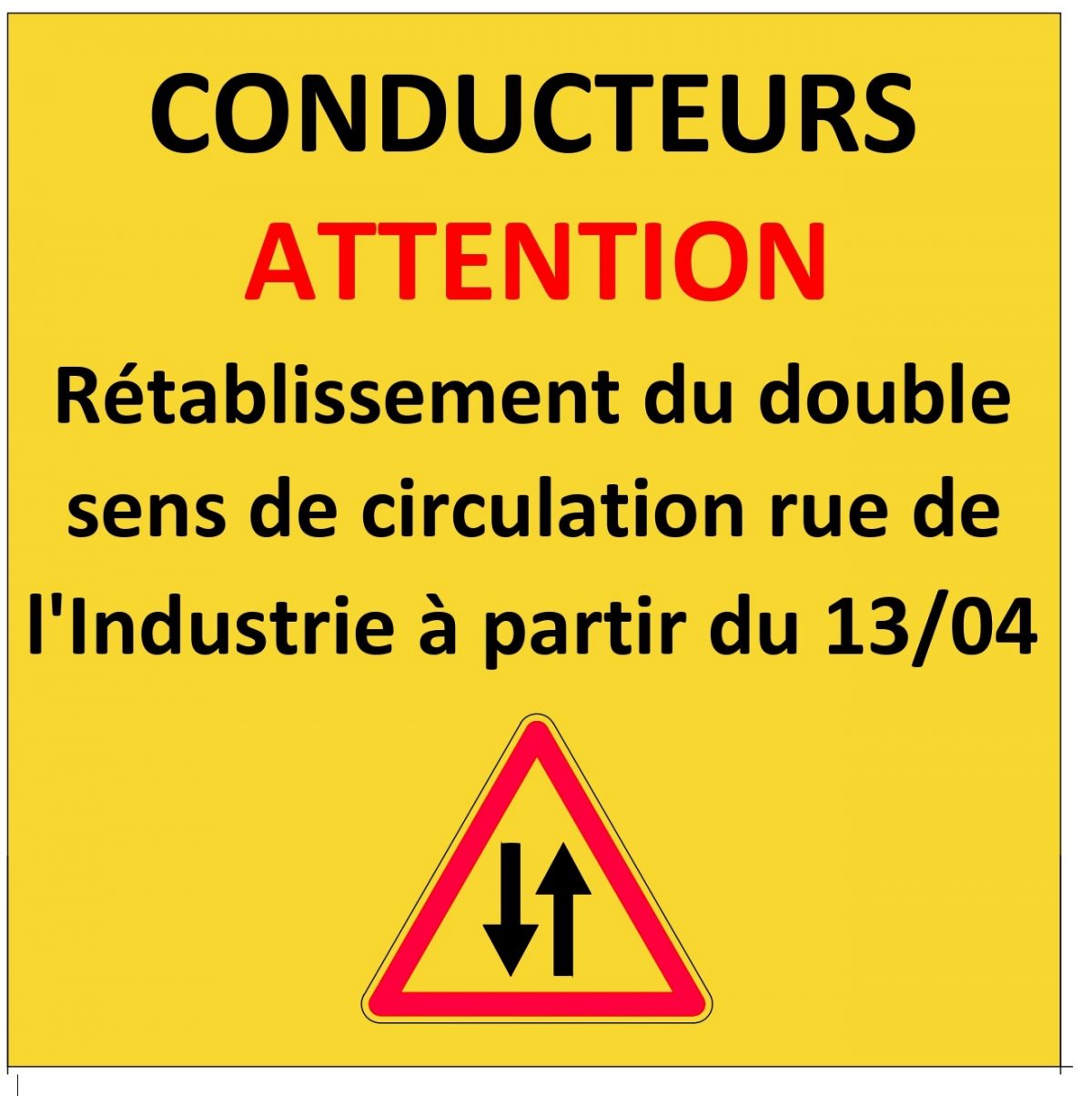 Attention : la circulation automobile sur la rue de l’Industrie sera rétablie définitivement en double sens à partir du lundi 13 avril