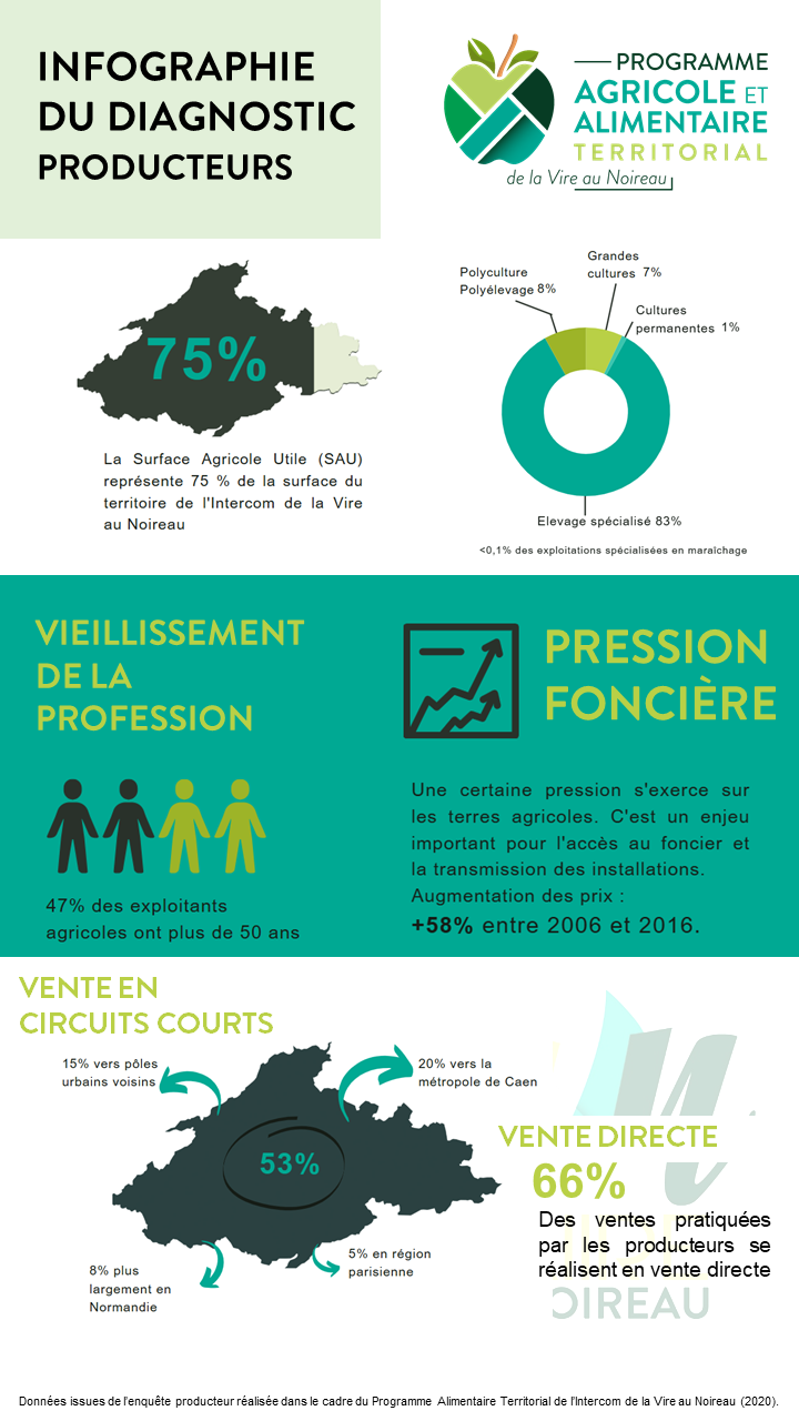 Au delà de cette infographie s’appuyant sur les données issues de l’enquête producteurs réalisée en 2020 et 2021, le diagnostic du Programme Alimentaire Territorial reprend de nombreuses autres données :